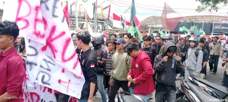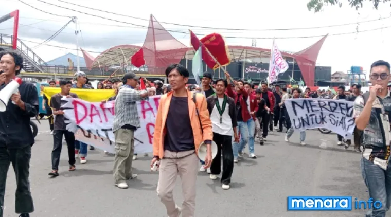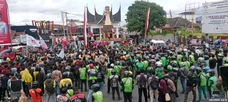 Menara Info, Bukittinggi - Mahasiswa dari berbagai universitas yang ada di Bukittinggi dan ojek online (ojol) menggelar aksi demo damai di Tugu Polwan, Bukittinggi, Sabtu (30/8)