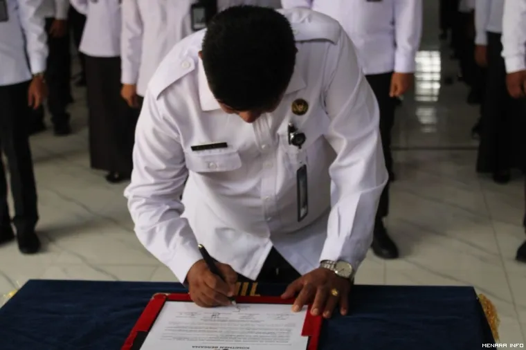 Kepala Lapas Kelas IIB Tanjung Pati, Elfiandi, A.Md.I.P., S.H., M.H., bersama seluruh Pejabat Struktural seperti Plh. KaKPLP Taufiqurrahman, S.Sos, Plh. Kasiminkamtib Hanif Budi Nugroho, S.Tr.Pas, Kasibinapigiatja Agung Lestara, S.Sos, dan Kasubag TU Intan Desi Mela Sari, S.H., M.H., secara bergantian membubuhkan tanda tangan mereka pada lembar komitmen.