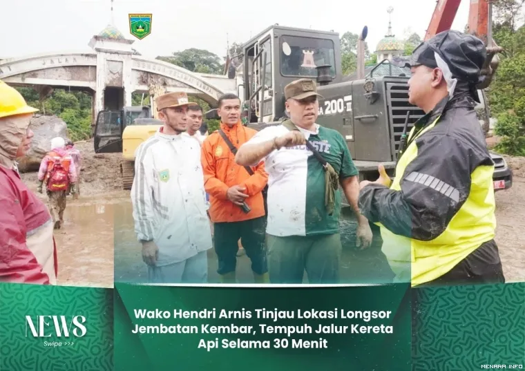 PADANG PANJANG – Wali Kota Padang Panjang, Hendri Arnis, meninjau langsung lokasi longsor di kawasan Jembatan Kembar, Jumat (28/11/2025). Untuk mencapai titik kejadian, ia harus berjalan kaki melewati jalur rel kereta api selama sekitar 30 menit akibat akses jalan utama yang terputus.