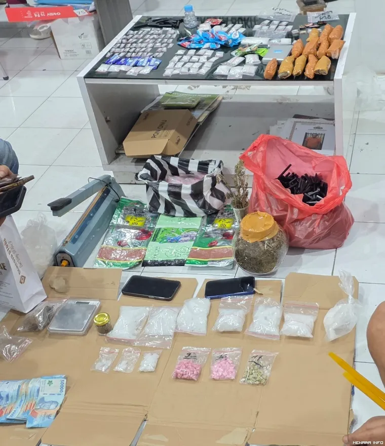 Dari tangan DK, aparat mengamankan barang bukti dalam jumlah besar, antara lain puluhan paket sabu-sabu yang dikemas dalam berbagai bentuk dan bungkusan makanan ringan, ratusan butir pil ekstasi dari berbagai merek, ganja kering dengan berat signifikan, serta sejumlah alat pendukung peredaran narkoba seperti timbangan digital, alat pres plastik, pirex, dan bong.