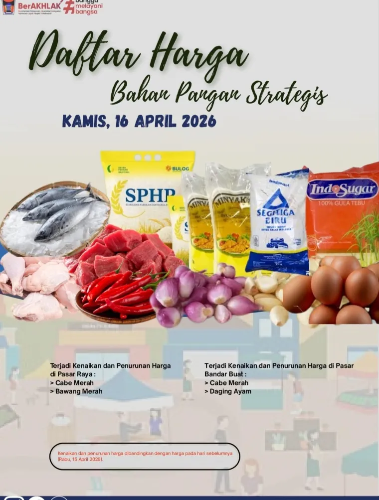 PADANG, Menara Info — Pergerakan harga bahan pangan strategis di Kota Padang pada Kamis (16/4/2026) menunjukkan dinamika naik dan turun pada sejumlah komoditas utama, terutama cabai merah, bawang merah, serta daging ayam di beberapa pasar tradisional.