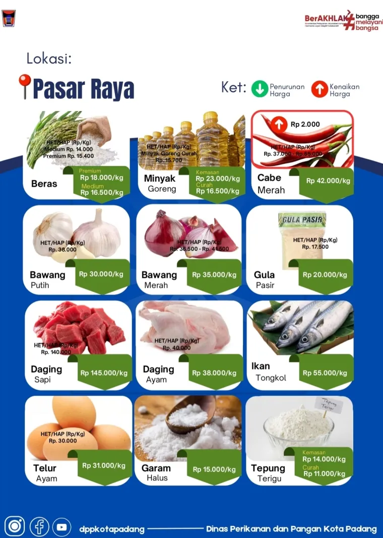 PADANG, Menara Info-Harga bahan pangan strategis di Kota Padang menunjukkan pergerakan beragam pada Jumat (24/4/2026), dengan kenaikan harga cabai merah di Pasar Raya serta fluktuasi pada bawang merah dan telur ayam di Pasar Bandar Buat. Data Dinas Perikanan dan Pangan Kota Padang mencatat, harga cabai merah di Pasar Raya mengalami kenaikan dibandingkan Kamis (23/4/2026). Tercatat harga cabai merah di Pasar Raya Padang Rp 42.000 per kilogram, sementara di Pasar Bandar Buat mencapai Rp 46.000 per kilogram. Sementara itu, komoditas lain seperti beras, minyak goreng, dan gula pasir relatif stabil, meski terdapat variasi harga antar jenis dan kualitas. Untuk komoditas beras di Pasar Raya, harga beras premium tercatat Rp18.000 per kilogram dan medium Rp16.500 per kilogram, masih di atas Harga Eceran Tertinggi (HET).